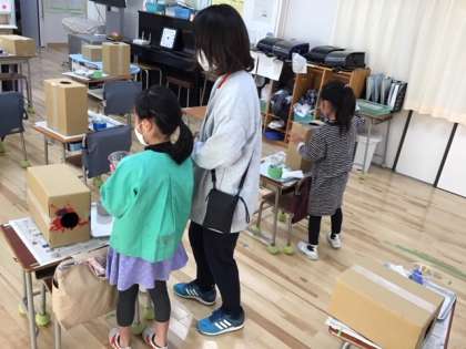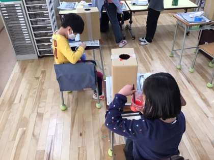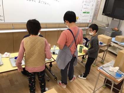 図工の時間です。「見えないせかい」色のたし算を楽しんでいます。