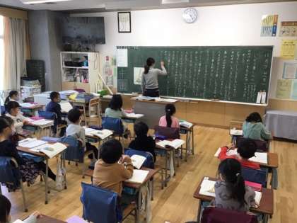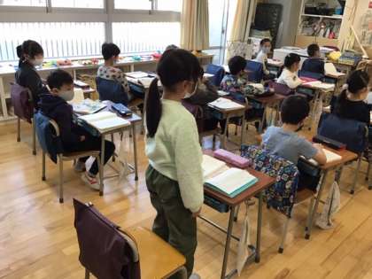 国語の時間です。「じどう車くらべ」説明文を読んで感想を発表しています。