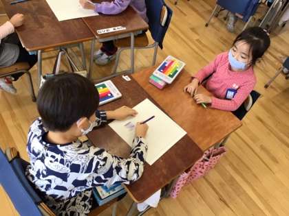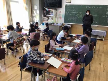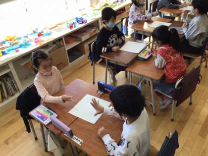 算数の時間です。「くらべかた」じんとりゲームをしながら、広さを比べる学習をしています。