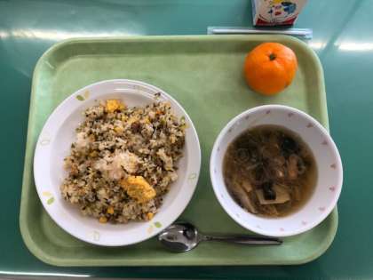献立 野沢菜チャーハン、春雨スープ、みかん、牛乳