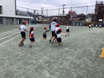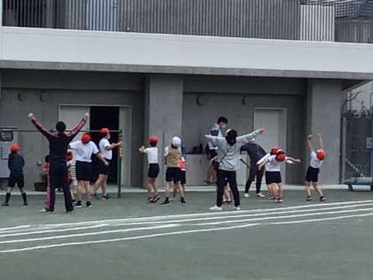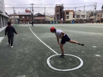 体育の時間です。準備運動をして、マラソンに取り組んだあと、クルミンピック2020に挑戦しています。