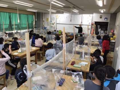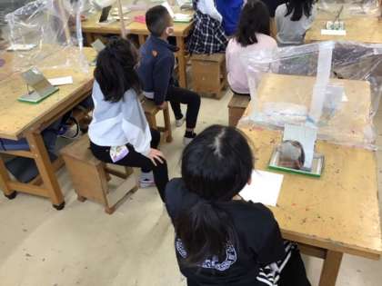 図工の時間です。自分の顔を鏡でよく見て、鉛筆と色鉛筆で描いていきます。