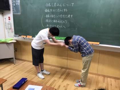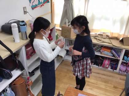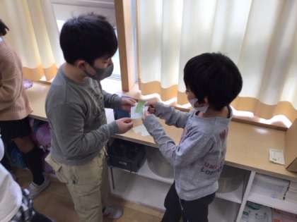 総合的な学習の時間です。将来の自分の職業を紹介しながら、名刺交換をしています。すごくかわいいです。