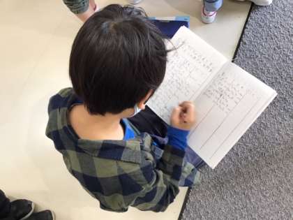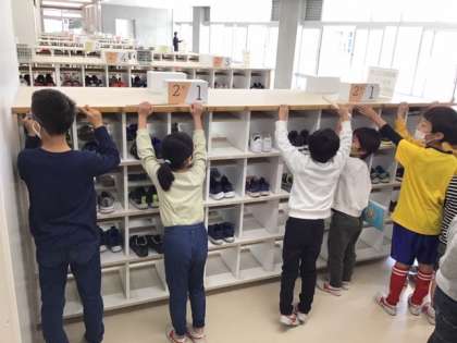 算数の時間です。みんなで協力して、靴箱の幅をはかっています。