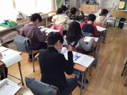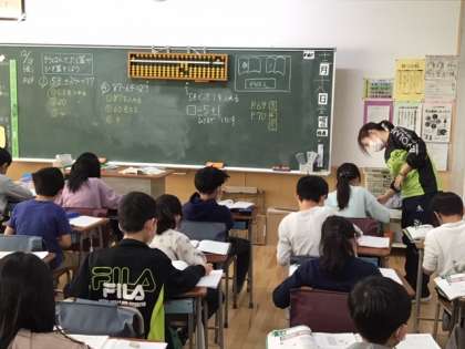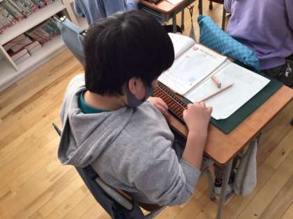 算数の時間です。「そろばん」を使って、たし算や引き算に挑戦しています。
