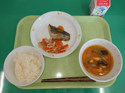 献立 ご飯、さわらのゆうあん焼き、れんこんの塩きんぴら、かぼちゃのみそ汁、牛乳