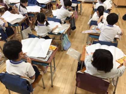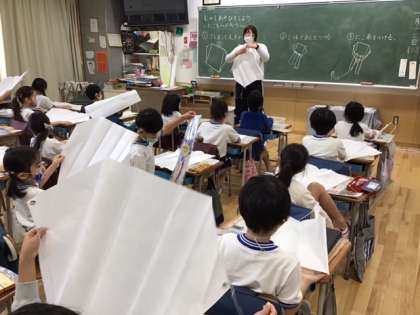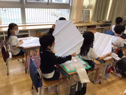 生活科の時間です。「むかしあそびをしよう!」これから凧づくりです。