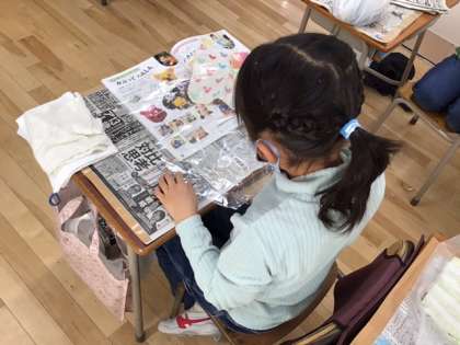 図工の時間です。「かぶって へんしん」お花紙を貼りつけて、お面を作ります。