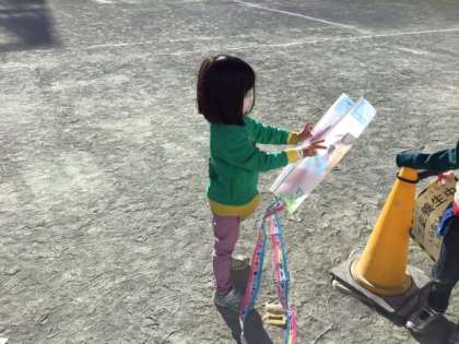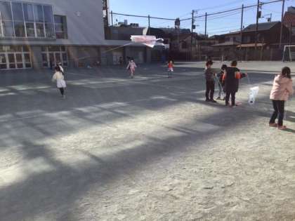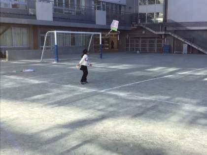 生活科の時間です。手づくりの凧で、凧揚げに挑戦しています。