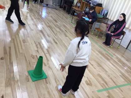 リトミックの時間です。音楽に合わせて、体を自由自在に動かします。
