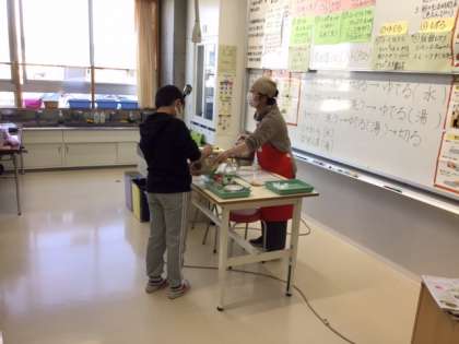 家庭科の時間です。「ゆで野菜のカラフルサラダ」を作りました。代表の児童3人がみんなの前で作ってみました。食べられないのが残念ですね。
