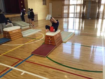 体育の時間です。跳び箱で「台上前転」に挑戦しています。きれいに膝が伸びていますね。