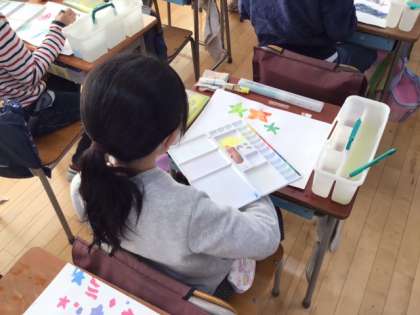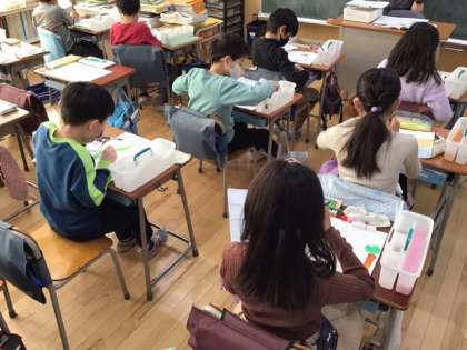 図工の時間です。絵の具のにじみが、とてもきれいですね。すてきな作品になりそうです。