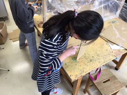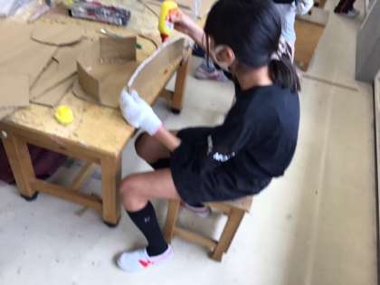 図工の時間です。ダンボールを切ったり、折り曲げたり、貼ったりして、自由に作品を作っていきます。
