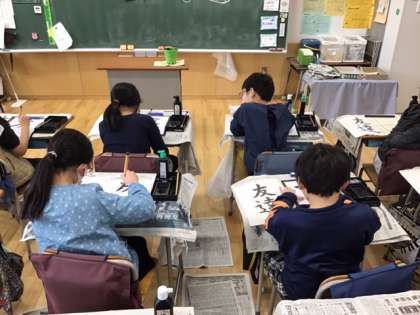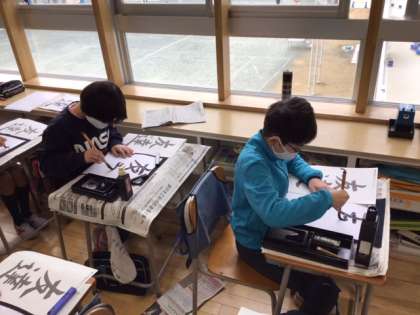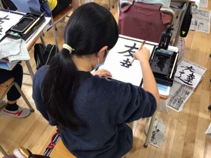 習字の時間です。今日の題字は、「友達」です。バランスをとるのが難しいですね。