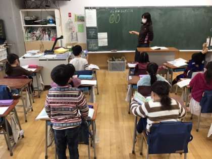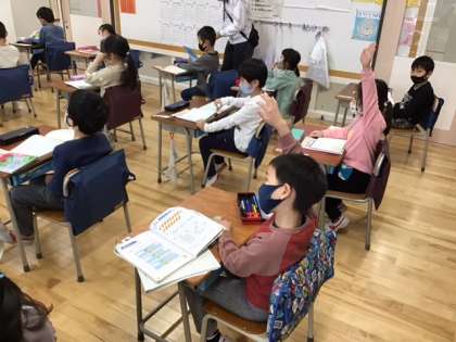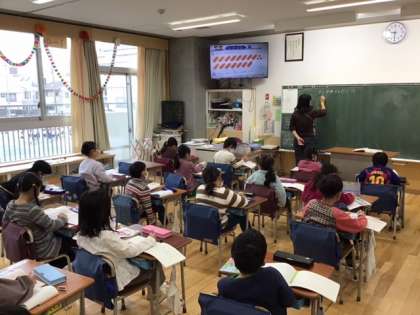 算数の時間です。「なんこあるでしょうか」10のまとまりを作って数えていきます。