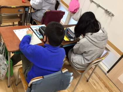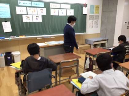 外国語の時間です。13の英語の文章を読んだり聞いたりして、それぞれ誰が言った内容かを考えています。