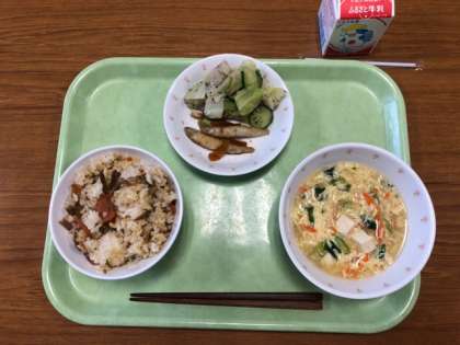 献立 深川飯、わかさぎの南蛮漬け、ゆかりあえ、かきたま汁、牛乳