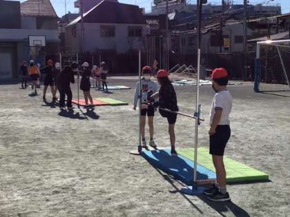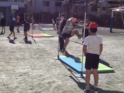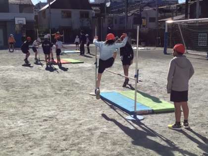 体育の時間です。走り高跳びに挑戦しています。助走のリズムが良くなり、踏み切りがあってきましたね。