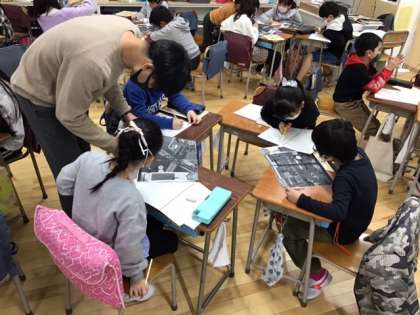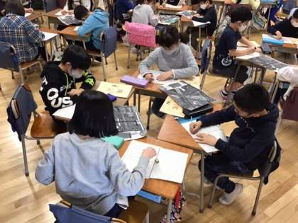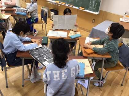 総合的な学習の時間です。資料を見ながら、学校の外、駅や道路のバリアフリーについて調べています。