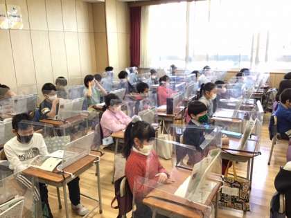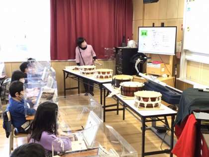 音楽の時間です。いろいろな和楽器の音色を神田囃子を聴きながら味わっています。