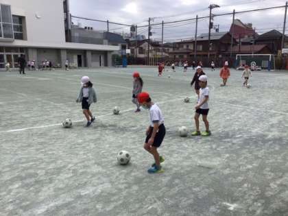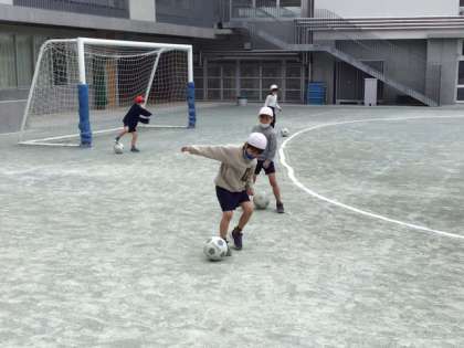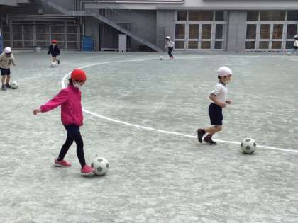 体育の時間です。ドリブルをして、笛が鳴ったら足の裏でボールを止めます。
