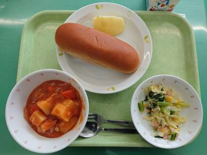 献立 黒砂糖パン、チキントマトシチュー、ツナサラダ、りんご、牛乳