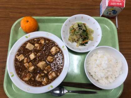 献立 ご飯、麻婆豆腐、じゃこサラダ、ぽんかん、牛乳