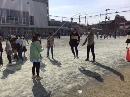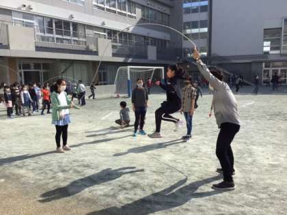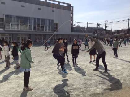 陽射しが暖かく、思わず体を動かしたくなる中休みです。6年生が、ダブルダッチに挑戦しています。