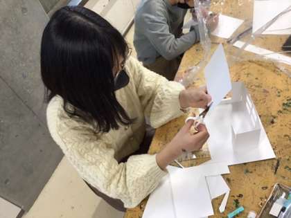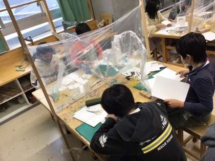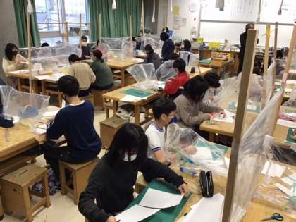 図工の時間です。「白い世界 なぞの入口から」紙の白さを活かして、自分だけの世界を表現します。