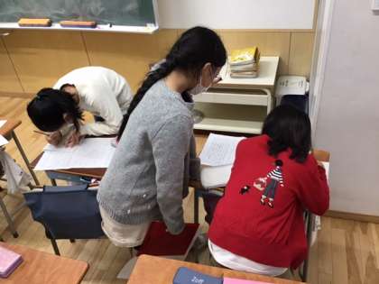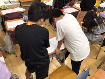 国語の時間です。「もしもの時に備えよう」友達同士で作文を読み合って、良いところや参考になるところなどを伝え合っています。
