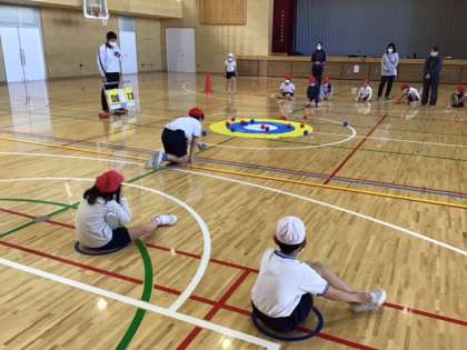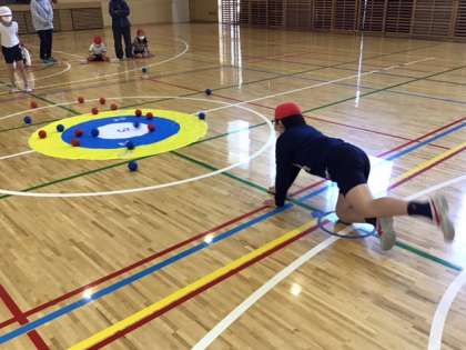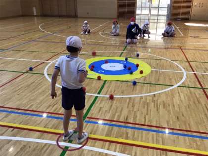 体育の時間です。楽しかったボッチャも、今日が最終戦になりました。高学年チームと低学年チームのどちらが勝つのでしょうか?