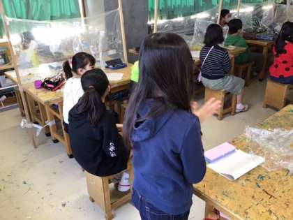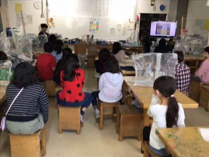 図工の時間です。「へんてこ山の物語」今日は発表会、へんてこな話をみんなで楽しんでいます。
