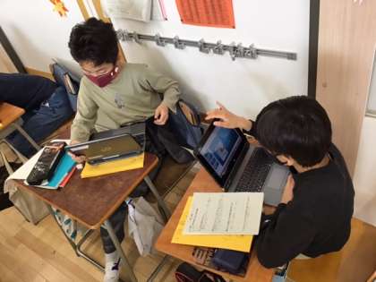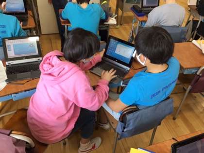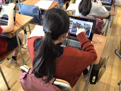 総合的な学習の時間です。「世界ともだちプロジェクト」パワーポイントを使って、プレゼンテーション資料を作成しています。