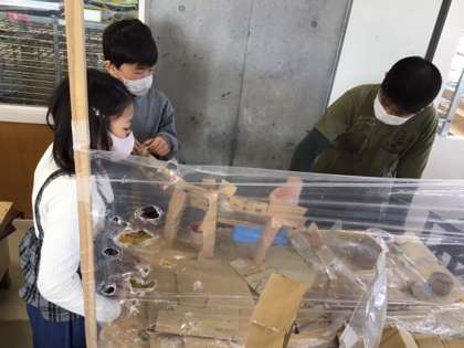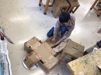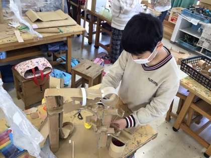 図工の時間です。「ダンボール ためして、つくって」ダイナミックな作品が次々と完成しています。