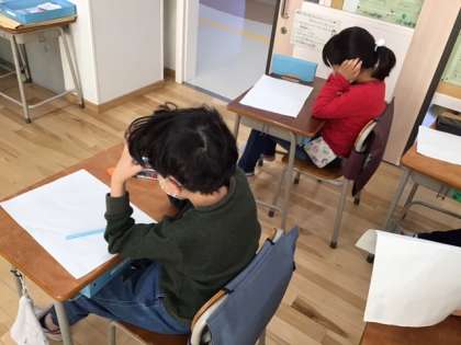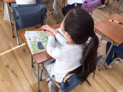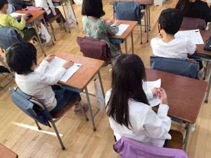 国語の時間です。「楽しかったよ、2年生」発表原稿を一生懸命に覚えています。