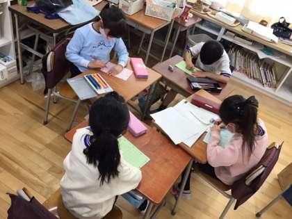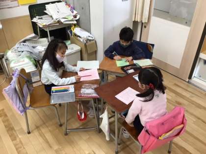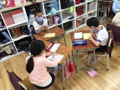 国語の時間です。「てがみで しらせよう」保育園のみなさんに、手紙の返事を書いています。