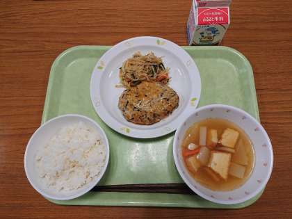 献立 ご飯、豆腐ハンバーグ、ざくざく、もやしと小松菜のごまじょうゆ和え、牛乳