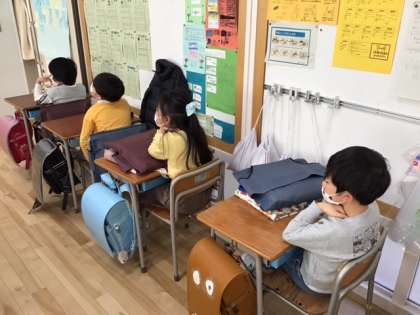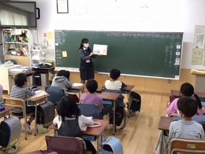 国語の時間です。司書の先生の読み聞かせに聴き入っています。楽しいお話ですね。