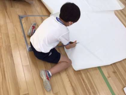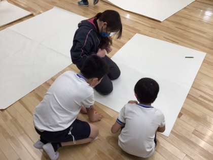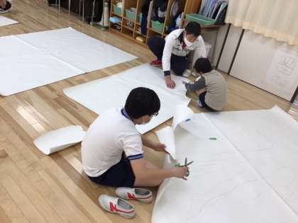 図工の時間です。「わくわく等身大」すごく大きな紙に自分の姿を写し取りました。次は、周りの線にそって、ハサミで切っていきます。
