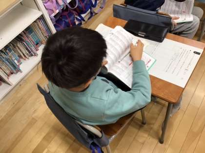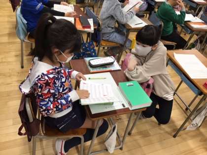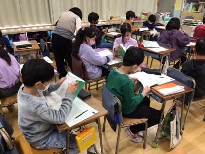 国語の時間です。漢字辞典を活用して、音訓の読みを両方使ってリズムのよい文を作っています。