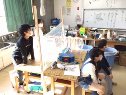 図工の時間です。「絵の具を使って本物に近い色をぬってみよう」石原先生による師範が素晴らしいです。