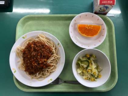献立 ミートソーススパゲッティ、コーン入りフレンチサラダ、デコポン、牛乳
