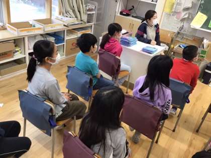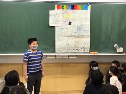 総合的な学習の時間です。「オリンピック・パラリンピック学習」のグループ発表をしています。グループで調べたことを壁新聞にまとめました。
