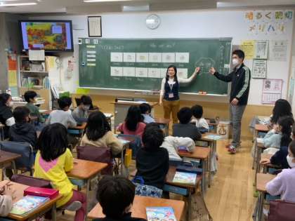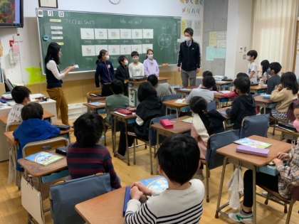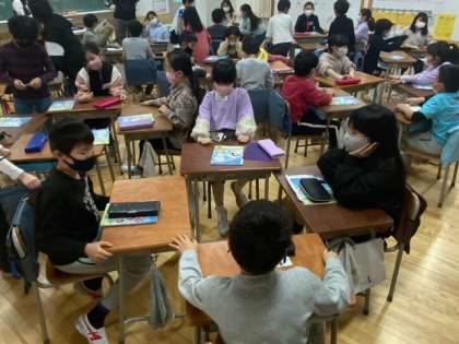 ALTの先生も入っての英語の授業では、「who are you?」を使って、動物当てクイズに挑戦しています。グループで動物を選び、ヒントを考えて、出題します。
