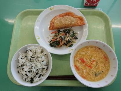 献立 わかめご飯、ジャンボぎょうざ、じゃこ入りナムル、中華風コーンスープ、牛乳