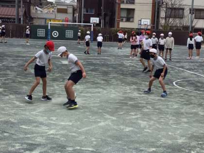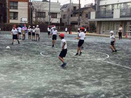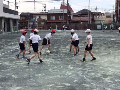 体育の時間です。ラインサッカーの試合です。ゴールがたくさん生まれています。