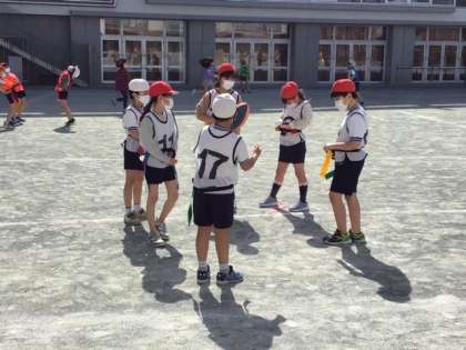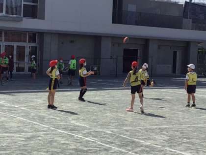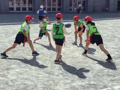 体育の時間です。チームごとに準備運動の後、パス練習、作戦会議をして、いよいよタグラグビーの試合になります。