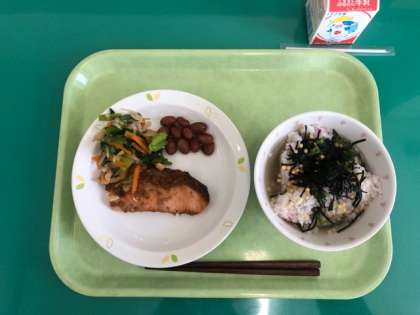 献立 梅茶漬け、鮭のごまみそ焼き、おひたし、煮豆(うずら豆)、牛乳