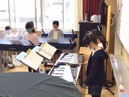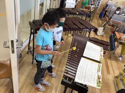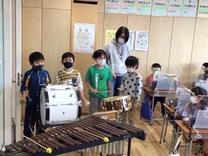 音楽の時間です。「アイアイ」の合奏発表会です。一生懸命に練習して、とても上手になりました。